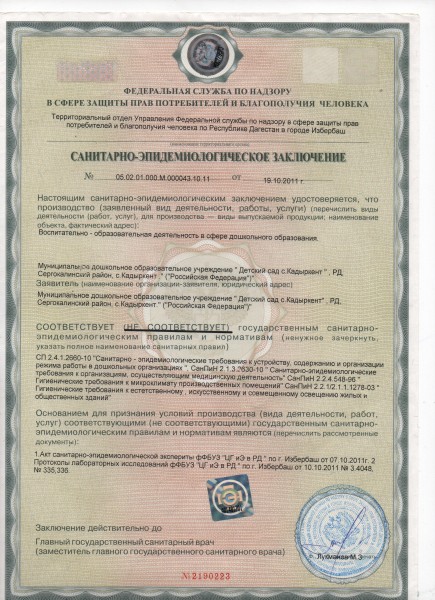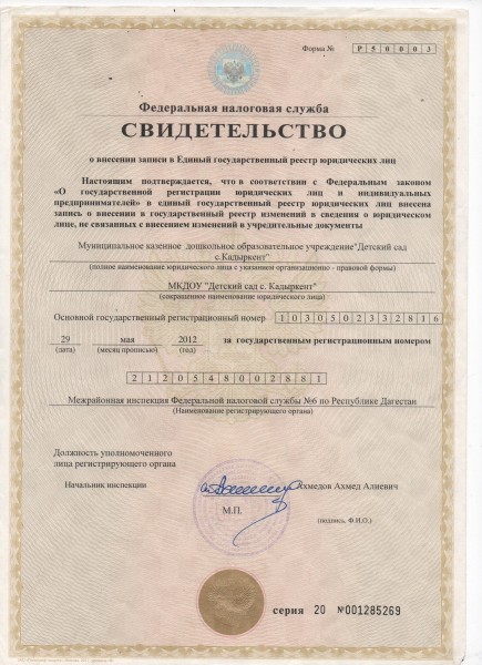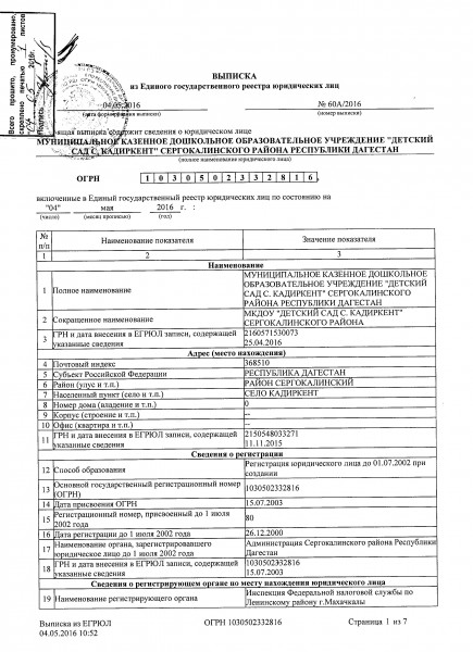 | Полное наименование образовательной организации* | Муниципальное казенное дошкольное образовательное учреждение "Детский сад с.Кадиркент" |